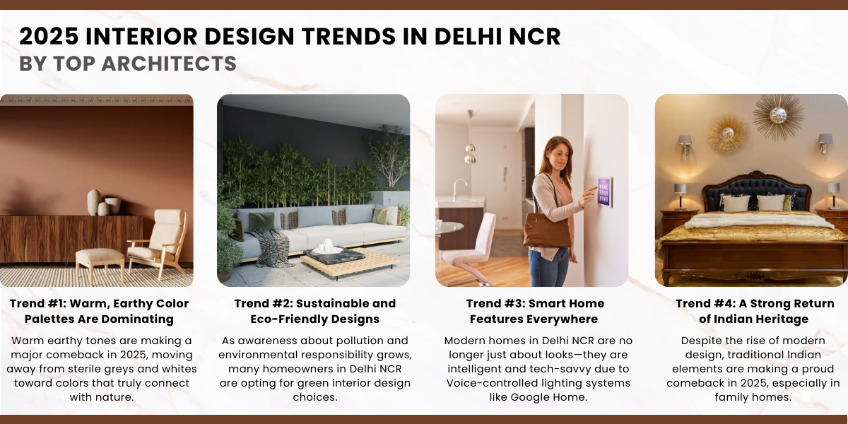 In 2025, interior design and architecture in Delhi NCR is undergoing an exciting shift — with a focus on sustainability, smart living, and style that reflects individuality. Whether you’re revamping a high-rise apartment in Noida, a villa in South Delhi, or a compact flat in Gurugram, these trends are shaping how modern Delhiites design their spaces.